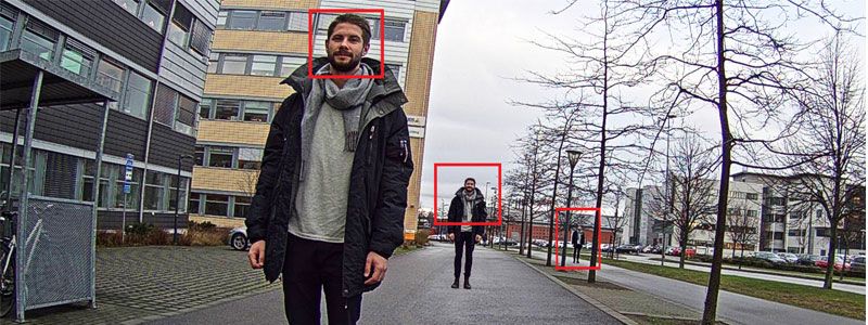 Для наглядности рассмотрим конкретный пример. На картинке ниже один и тот же человек снят так, что его изображение занимает 20%, 40% и 140% от высоты кадра. В первом случае система видеоаналитики сможет обнаружить движущийся объект, во втором — однозначно распознать в нем человека, а в третьем — провести идентификацию по лицу.