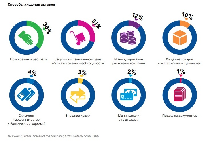 По официальной статистике российский ритейл ежегодно теряет свыше миллиарда рублей из-за краж (по данным «СерчИнформ»), причем от 35% до 80% из них совершает персонал торговых предприятий, тогда как доля хищений со стороны самих покупателей не превышает 20% и приходится, в основном, на магазины самообслуживания. Согласно исследованию, проведенному консалтинговой компанией KPMG, структура правонарушений выглядит следующим образом.