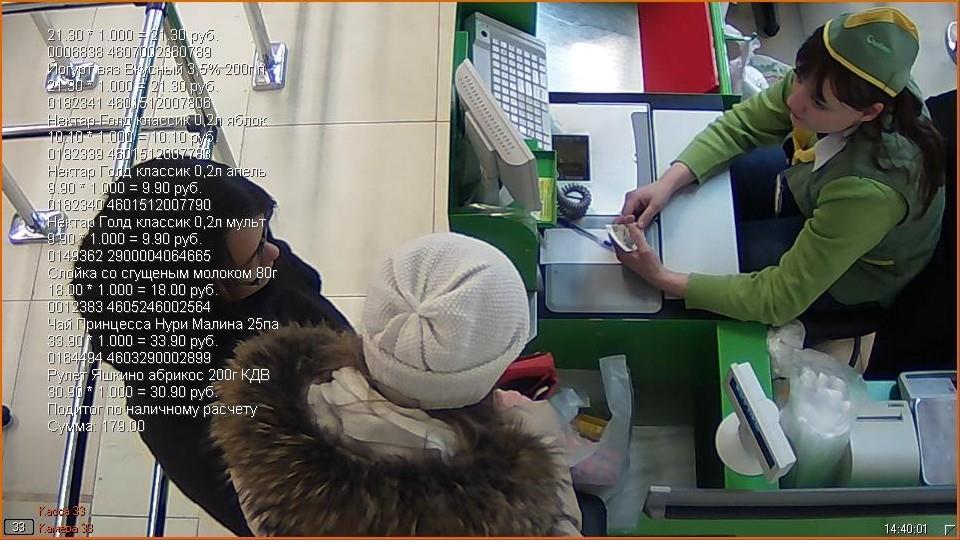 С точки зрения «железа» практически ничего не меняется. Для наблюдения за кассовыми терминалами все также используются сетевые купольные камеры с матрицей 2 Мп или выше, способные вести съемку в разрешении не менее, чем 1920×1080 пикселей с фреймрейтом 25 к/c, по одной на каждую кассу, подключенные к видеосерверу. Ключевое различие заключается в том, что интеллектуальные системы видеонаблюдения тесно интегрированы с IT-инфраструктурой торгового предприятия, за счет чего становится возможен событийный видеоконтроль: операции, совершаемые на POS-терминале, сопоставляются с видеозаписью действий кассира, при этом служебная информация (например, количество и наименование товара, сумма чека) выводится в отдельном окне или в виде титров, наложенных на изображение.