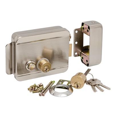 Электромеханический накладной замок, НЗ, универсальный, цилиндр снаружи, цилиндр и кнопка изнутри, блокировка ключом в закрытом состоянии, никелированная сталь, 12 В, 3,5 А, 163х47х103 мм