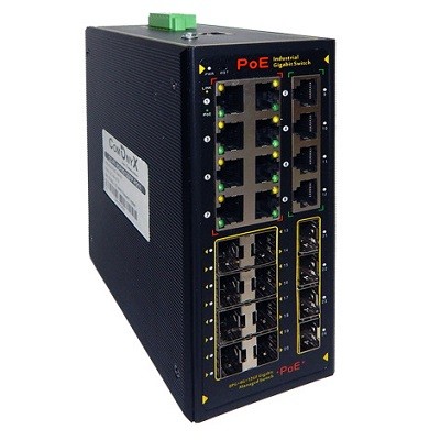Промышленный РоЕ коммутатор 12 портовый управляемый; 8xPoE 10/100/1000 RJ45; 4xUplink 10/100/1000 Base-TX RJ45 ; 12хSFP 100/1000; Суммарная мощность РоЕ 240 Вт; DC 48-57 В; IP40; -40...+75°C; 165х148x68.5 мм. Крепление на DIN рейку.