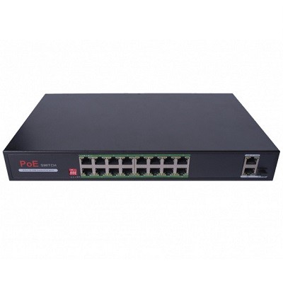 PoE коммутатор с функцией антизависания для CCTV предназначен для коммутации IP-устройств по проводной сети. Коммутатор оснащен 16 LAN-портами с поддержкой питания РоЕ-устройств до 30Вт на порт,  двумя LAN-портами без РоЕ и оптическим портом, совмещенным с одним LAN-портом. Суммарное PoE питание до 200Вт. Управление коммутатором осуществляется DIP-переключателями для изменения длины линии и работы VLAN, перезапуска РоЕ-портов и отключения РоЕ портов при привышении суммарной мощности. Исполнение в металлическом корпусе классом защиты IP30 с комплектом крепления в 19" стойку или шкаф. Питание от источника  тока AC 100~240В.