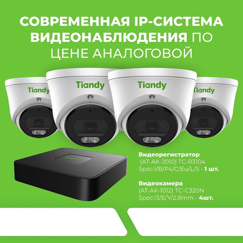 В комплекте 4 камеры ((AT-AK-1012) TC-C320N Spec:I3/E/Y/2.8mm) и 1 видеорегистратор ((AT-AK-2010) TC-R3104 Spec:I/B/P4/C/Eu/L/S).