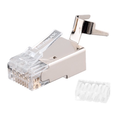Коннектор RJ45/8P8C под витую пару, Кат.6a(Класс Ea), 500МГц, покрытие 50мкд, универсальные ножи, экранированный, со вставкой, с хвостовиком, круглый ввод, диаметр изоляции проводников 1.35-1.45 мм, уп-ка 100шт.