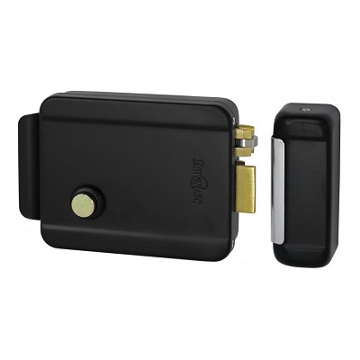 Электромеханический накладной замок Smartec ST-RL073SI-BK, черный, НЗ, универсальный DIN, цилинр снаружи, кнопка изнутри, питание 12VDC/1А, -40°+50°С, окрашенная сталь.