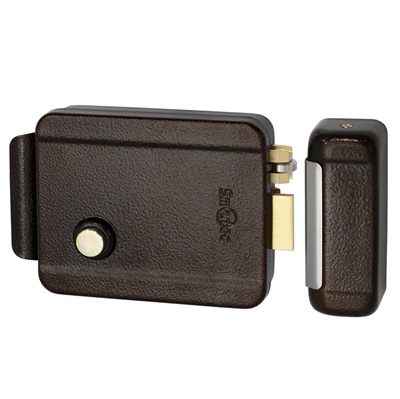 Электромеханический накладной замок, НЗ, универсальный DIN, цилиндр снаружи, кнопка изнутри, питание 12VDC/1А, -40°+50°C, окрашенная сталь, цвет - коричневый.