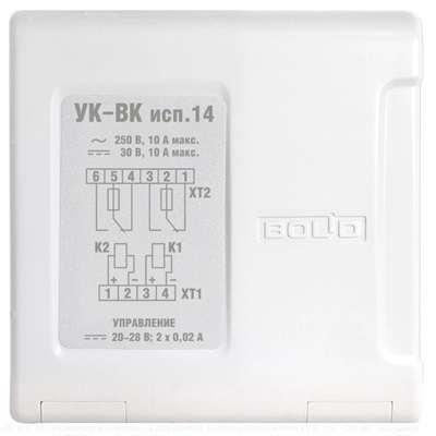 Устройство коммутационное; 2 реле, контакты на переключение; U-упр.24 В; I-упр.20 мА; U-коммут. до 250 В; I-коммут.до 10 А; IP30; t-раб.-30...+50°С; 102х107х39 мм. На DIN рейку.