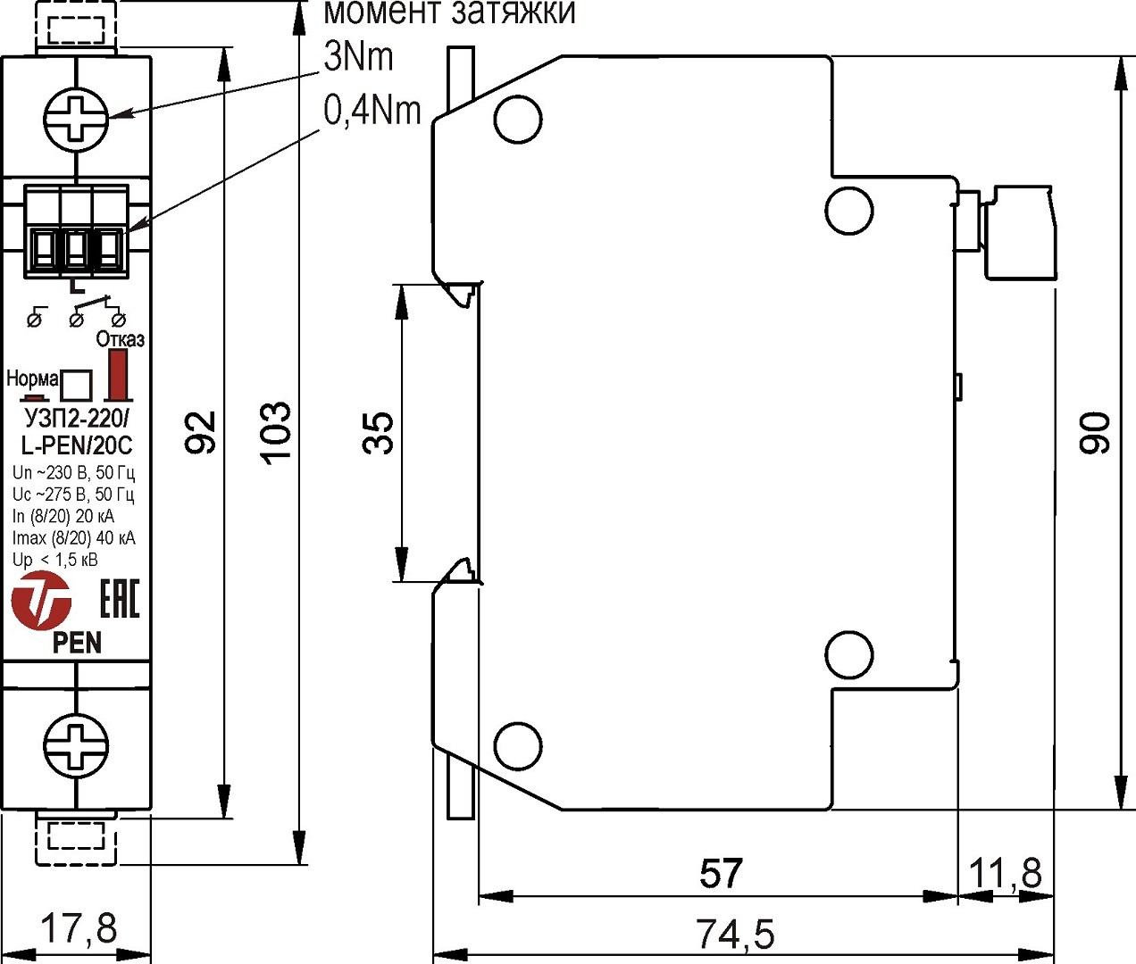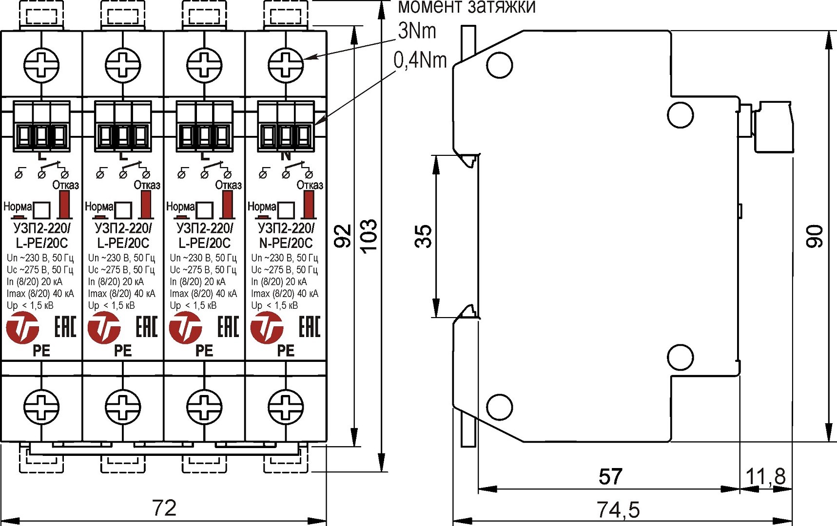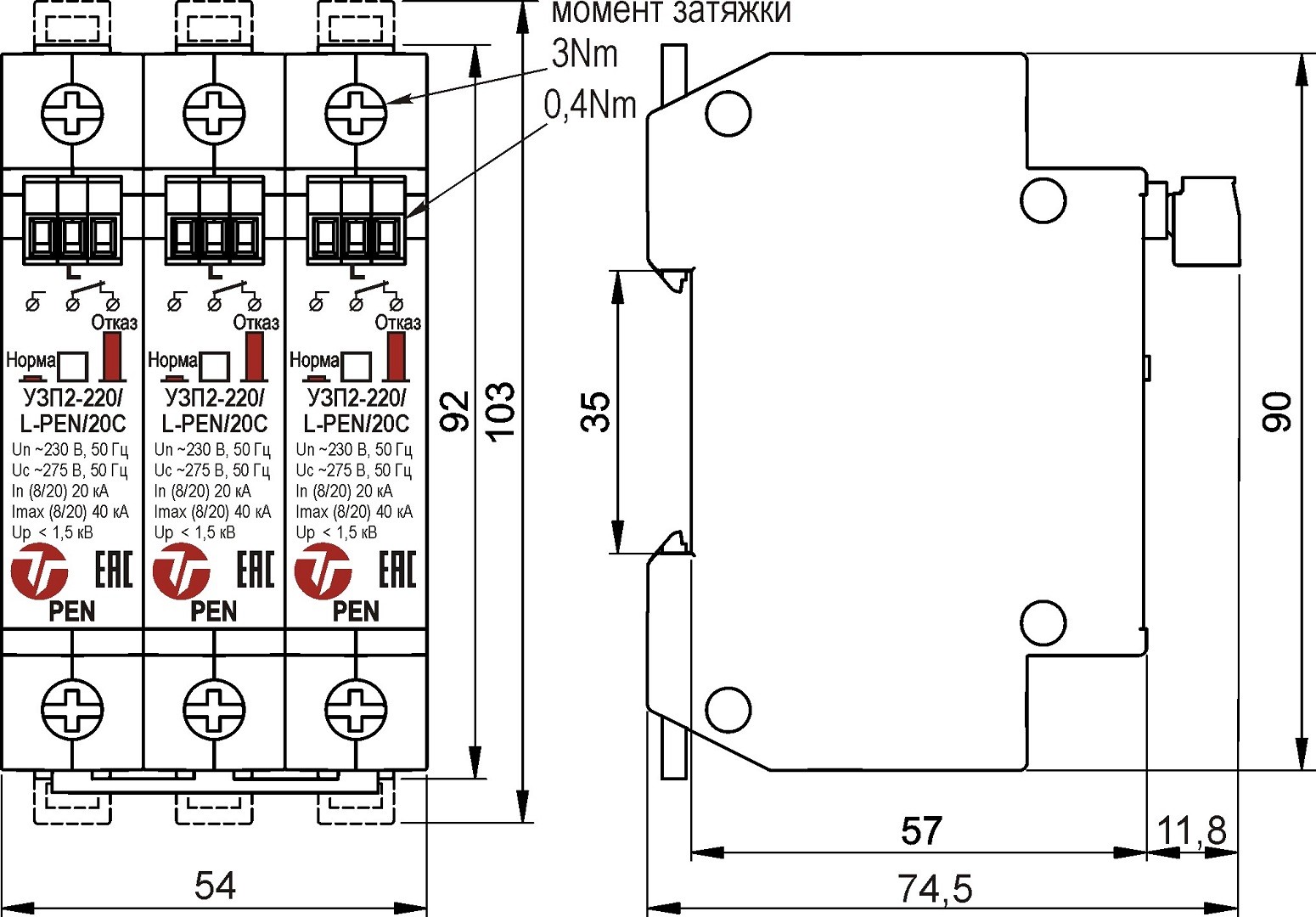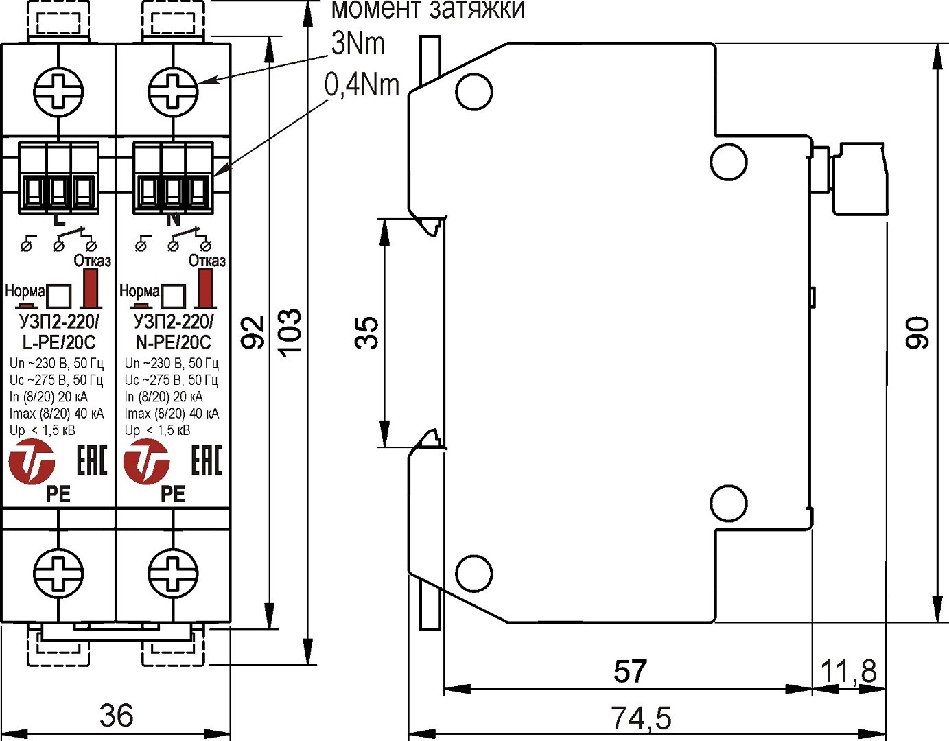 Габаритные размеры УЗП2-220К/3LN-PE/20
