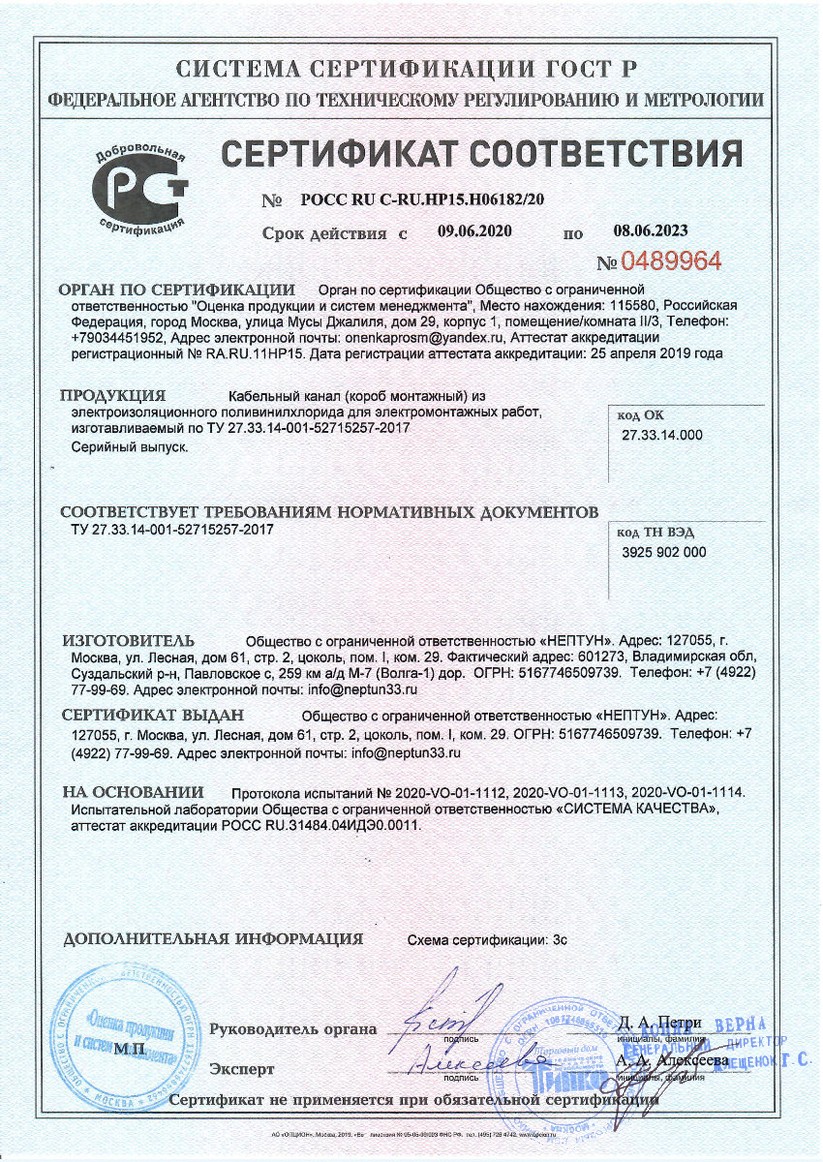 Сертификат Кабель-канал белый 2-й замок в п/э 15х10 (234м/уп) Промрукав PR.0325201