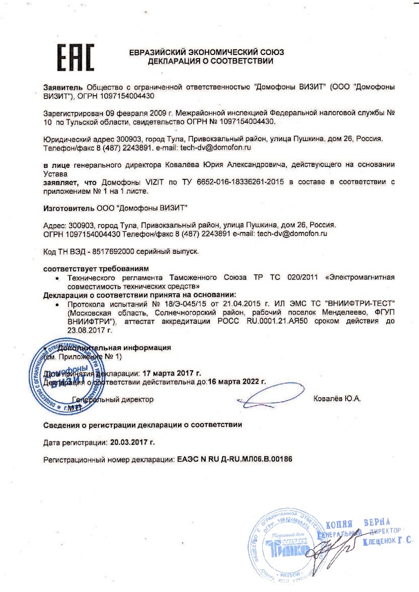Декларация о соответствии TRASSIR XVR-5104 V2