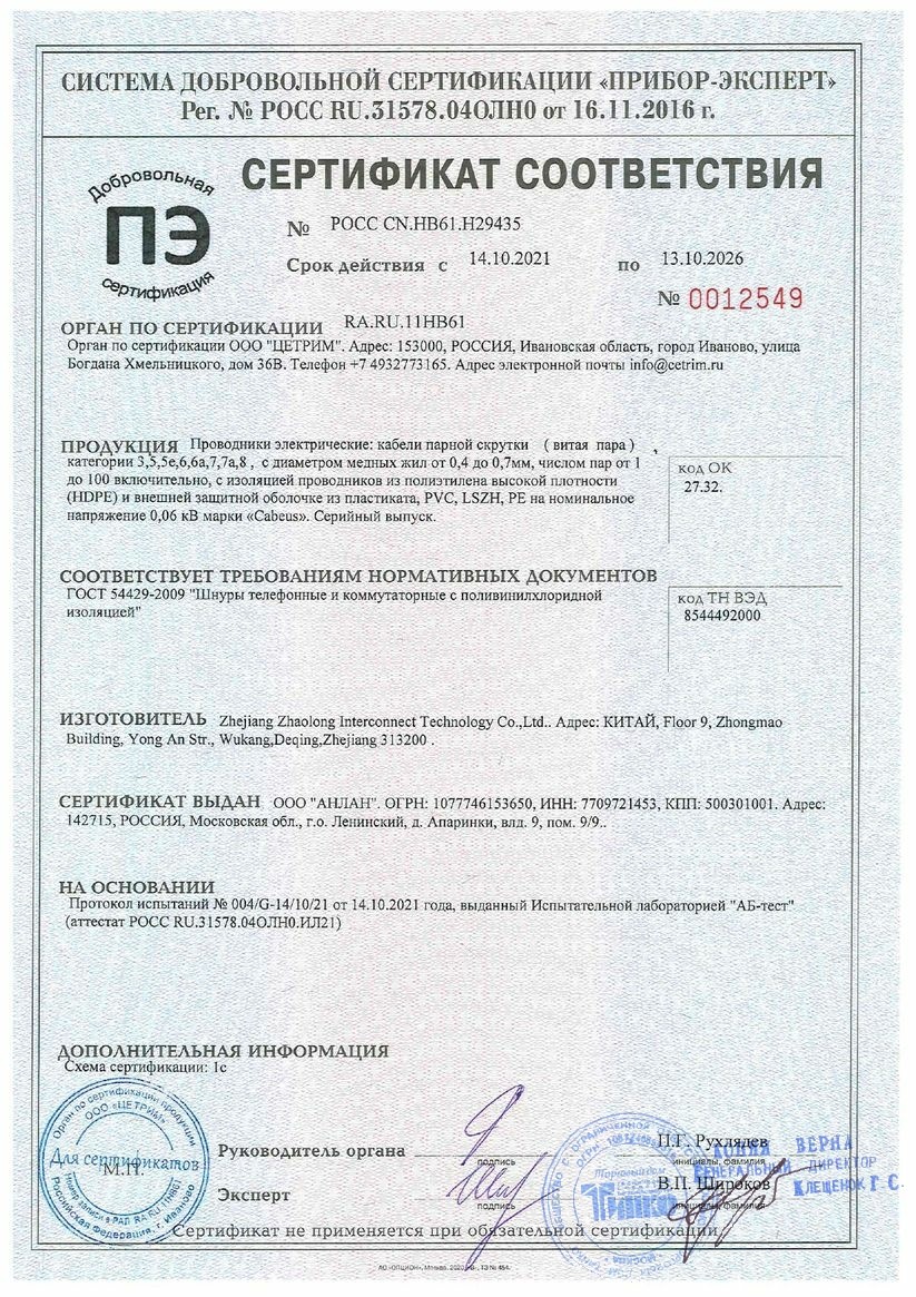 Сертификат UTP-4P-Cat.5e-SOLID-LSZH-GY-LIGHT-100