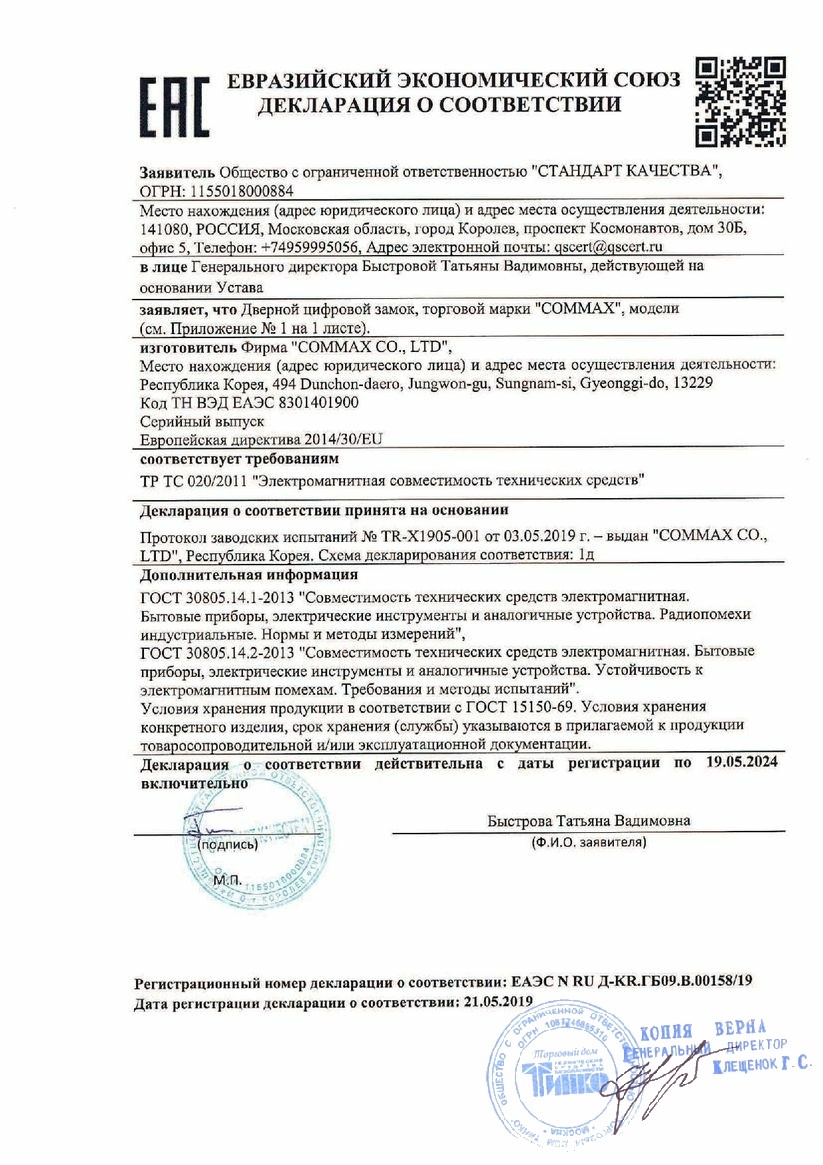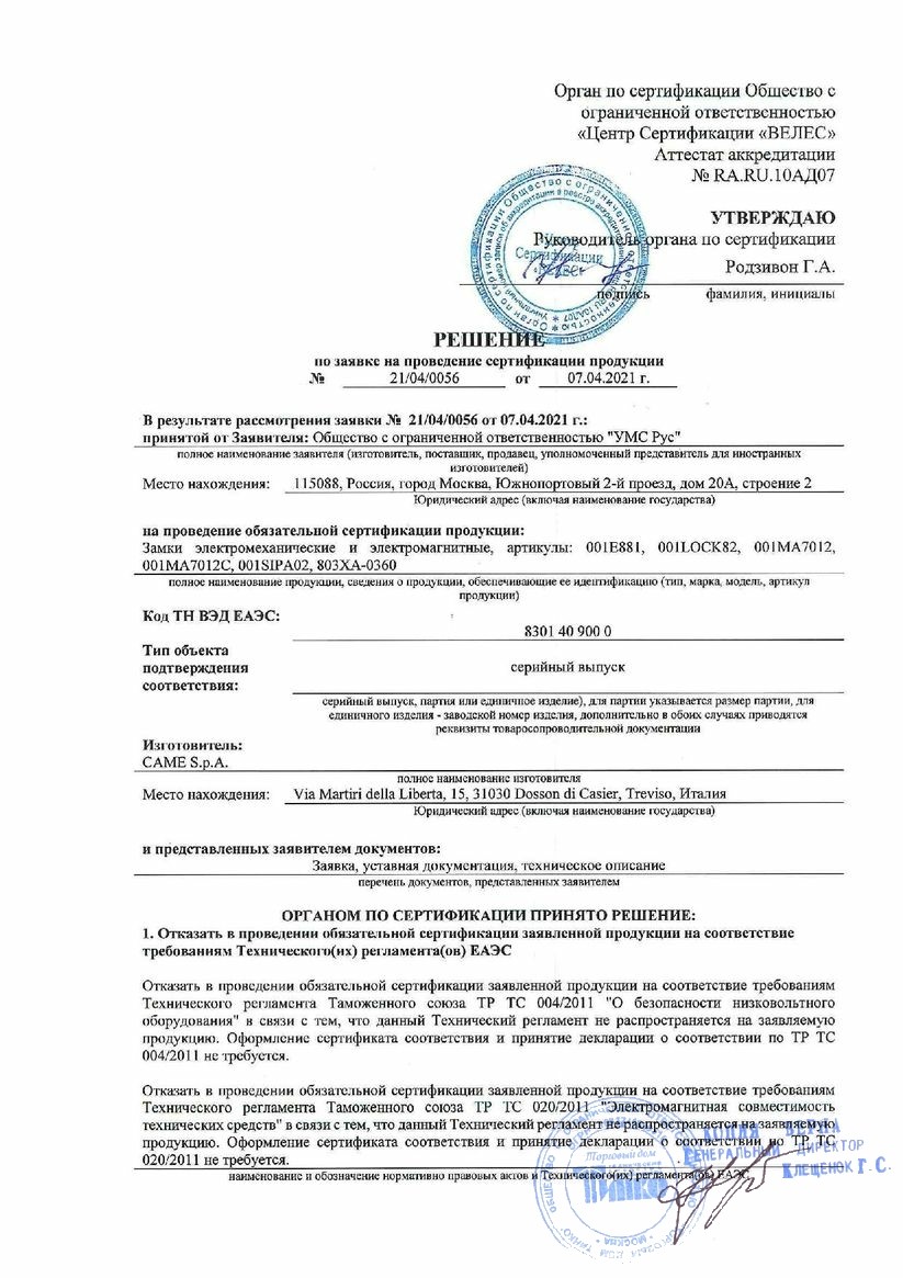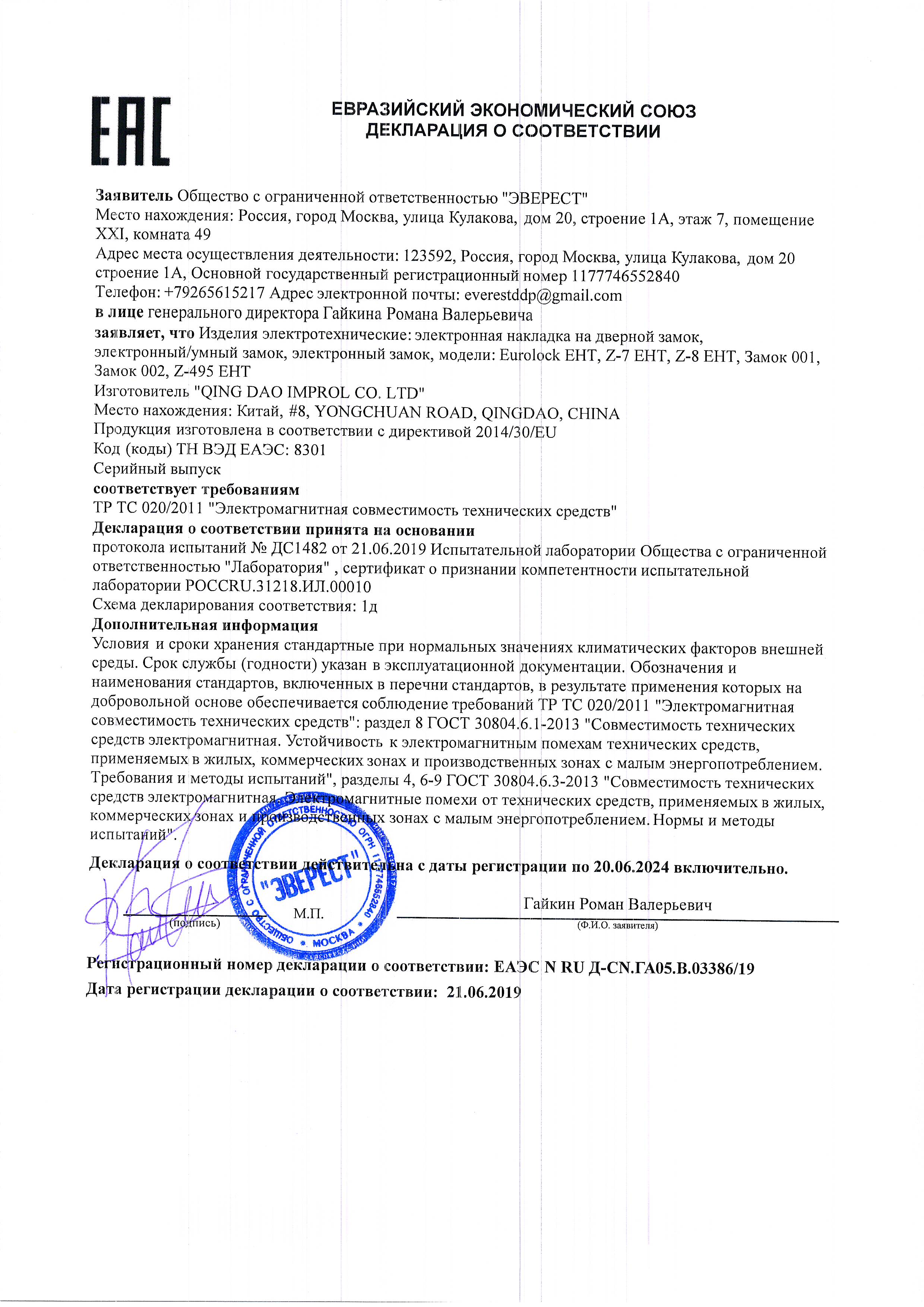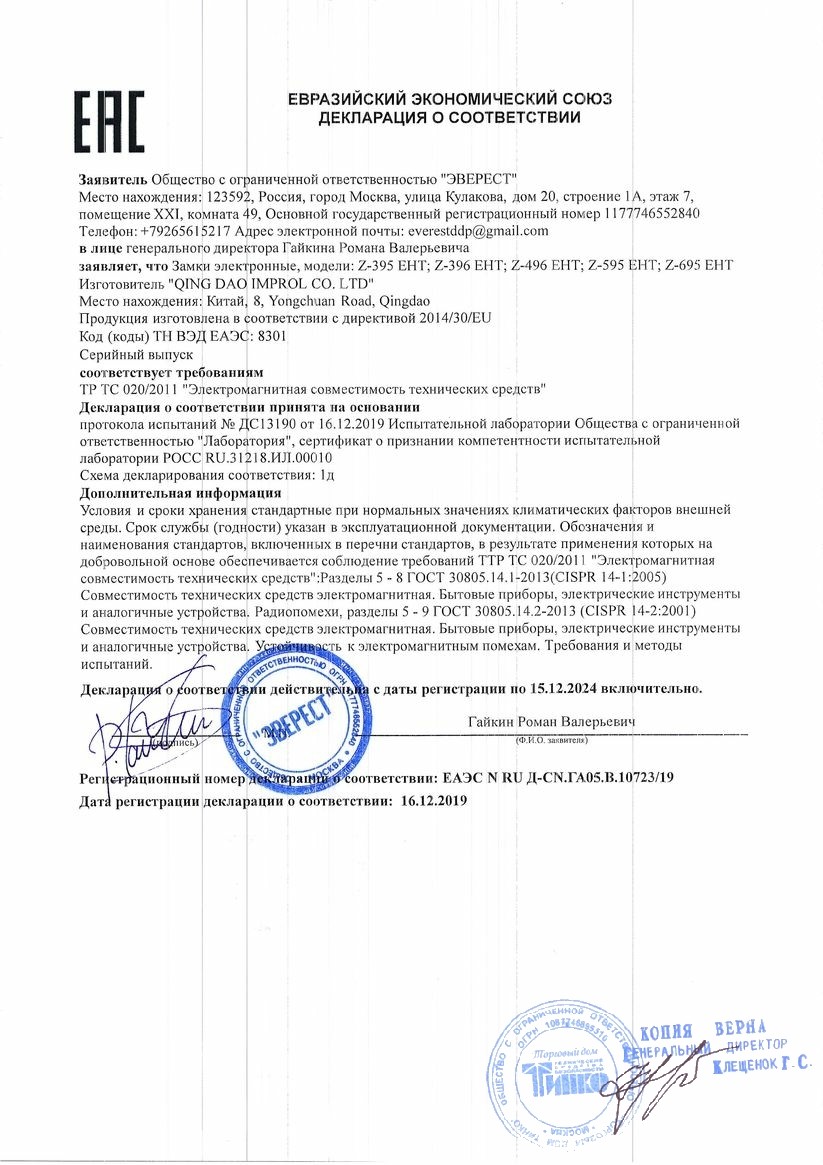 Декларация о соответствии Замок электромех-й врезной 004 (зап.часть для замка Z-Eurolock)