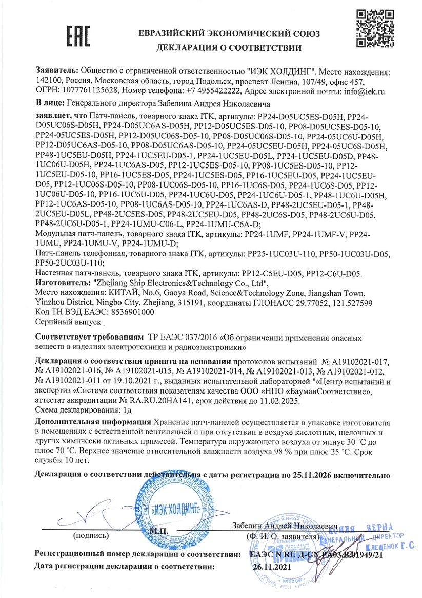 Сертификат Патч-панель ITK 1 юнит категория 5Е UTP 24 порта (Dual)