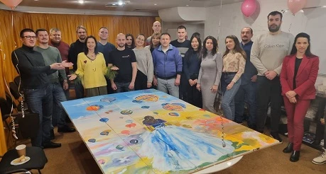 Главным подарком стала картина, в создании которой принял участие каждый сотрудник компании, в том числе и сама Елена.
