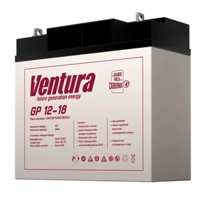 Аккумулятор обладает низким внутренним сопротивлением, он может использоваться в буферном и циклическом режимах. Благодаря своим характеристикам (18 Ач, 12 В) и продолжительному сроку службы (8 лет) он применяется в ИБП, нефтегазовой отрасли, охранно-охранных системах и телекоммуникациях. Корпус представляет из себя герметичный моноблок, выполненный из ABS-пластика, на крышке которого располагается односторонний клапан избыточного давления, это позволяет использовать Ventura GP 12-18 в горизонтальном и вертикальном положении (установка на крышку не допускается). Сепараторы из стекловолокна (AGM) удерживают жидкий электролит неподвижно.