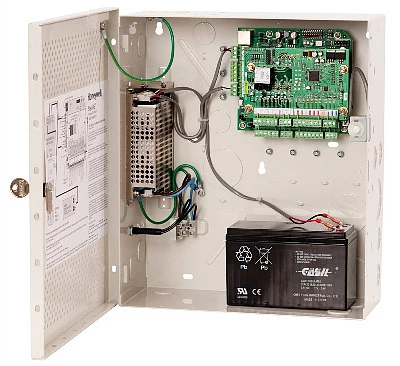 Контроллер СКУД NetAXS-123, одна дверь (макс. 2 считывателя), стандартный металлический корпус с датчиком вмешательства и блоком клемм, содержит блок питания 12 В пост. тока / 4 А и аккумулятор 12 В, 7 А·ч для электропитания системы и замков на 12 В