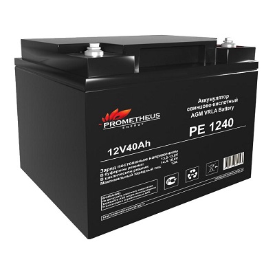 Свинцово-кислотный аккумулятор Prometheus Energy PE 1240 создан по технологии AGM, с абсорбированным электролитом. Предлагаемый аккумулятор является не обслуживаемым. Он герметизирован, а образующийся газ рекомбинируется. Долив жидкости не требуется. Корпус аккумулятора изготовлен из негорючего ABS пластика. Емкость аккумуляторной батареи для ИБП составляет 40 Ah, а рабочее напряжение 12 V. Устройство обладает низким саморазрядом (до 3%). Срок службы достигает 6 лет.