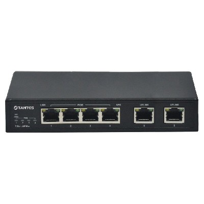 Tantos TSn-4P6n - это 6-портовый неуправляемый коммутатор с 4 портами PoE 10/100Мб/с (с внешним блоком питания). Порты с поддержкой POE могут автоматически обнаруживать PoE и служить источником питания для устройств, поддерживающих стандарты IEEE802.3af и IEEE802.3at (таких как VoIP телефон, PoE точки доступа, IP-телефоны, камеры IP и т.д.).