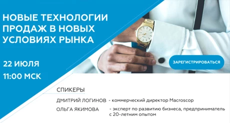22 июля в 11 часов пройдет вебинар «Новые технологии продаж в новых условиях рынка», который проведут коммерческий директор Макроскоп Дмитрий Логинов и предприниматель с 20-летним стажем в продажах, эксперт по управлению персоналом и развитию бизнеса Ольга Якимова.