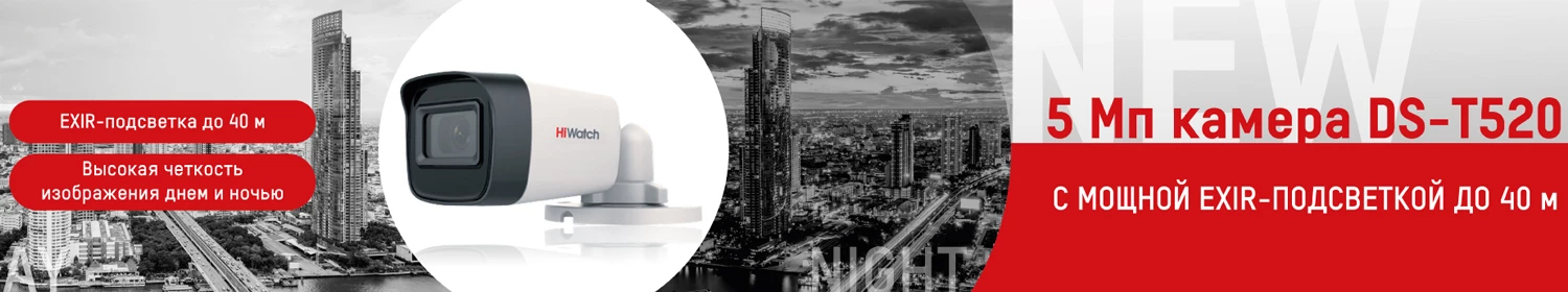 Обновилась линейка мультиформатных камер HiWatch. Новая модель DS-T520 оснащена матрицей с высокой чувствительностью и мощной EXIR-подсветкой дальностью до 40 м.