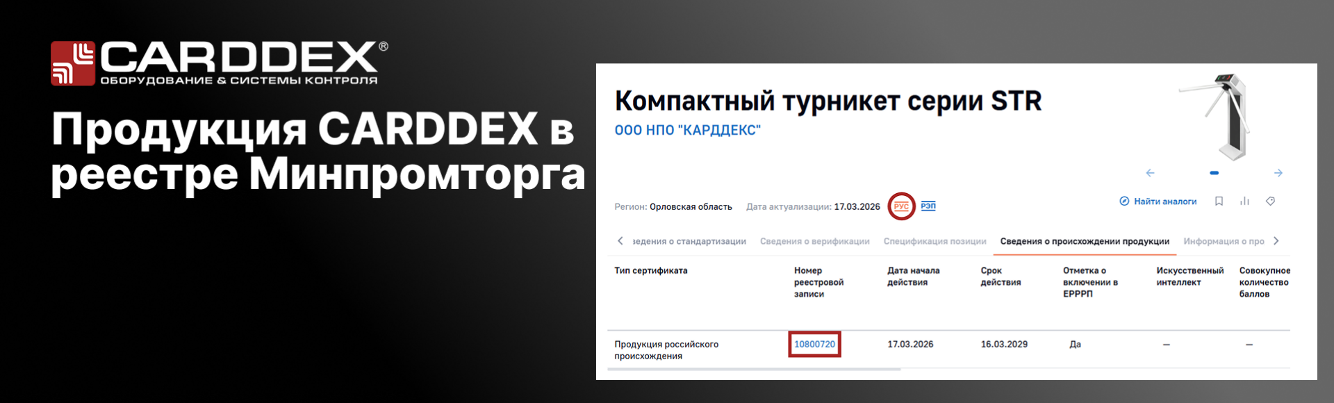 Турникеты STR, STL и картоприемники KR CARDDEX получили сертификат СТ-1